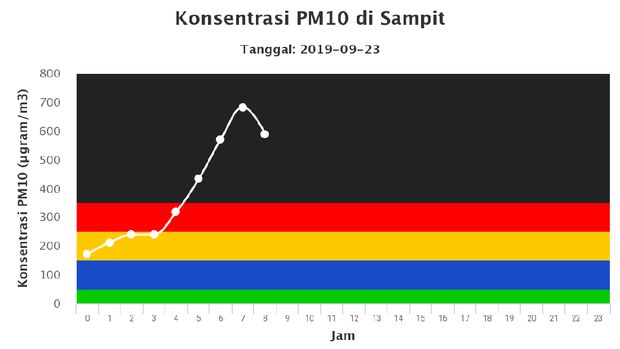 Kualitas udara di Kota Palembang, Sumatera Selatan, terus memburuk sejak pukul 12 dini hari tadi yakni 683 µgram/m3 atau dalam status sangat tidak sehat. Dua jam kemudian udara memasuki status berbahaya (406 µgram/m3). Udara terus memburuk hingga pada pukul 8:00 WIB ini berada pada status berbahaya (500 µgram/m3).